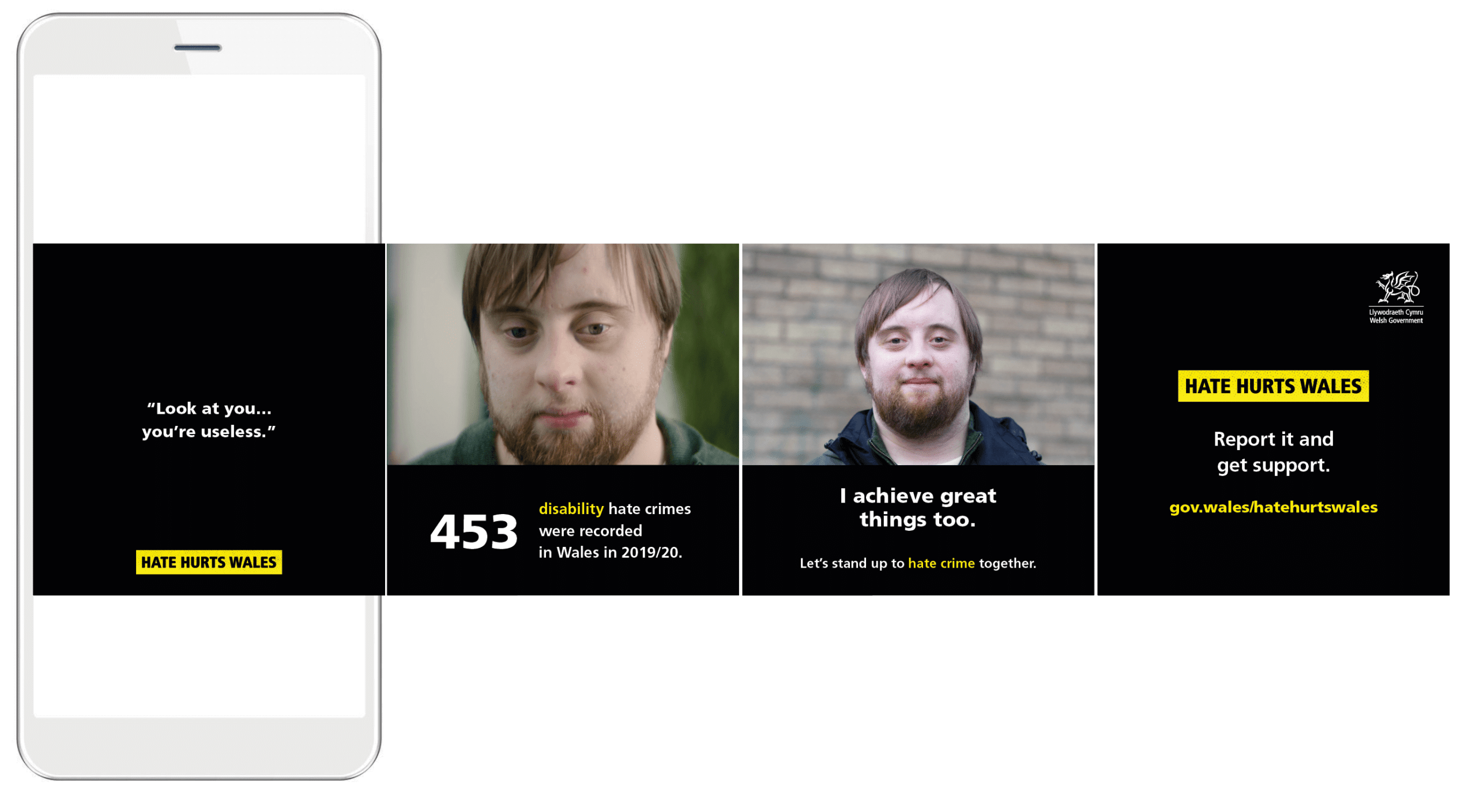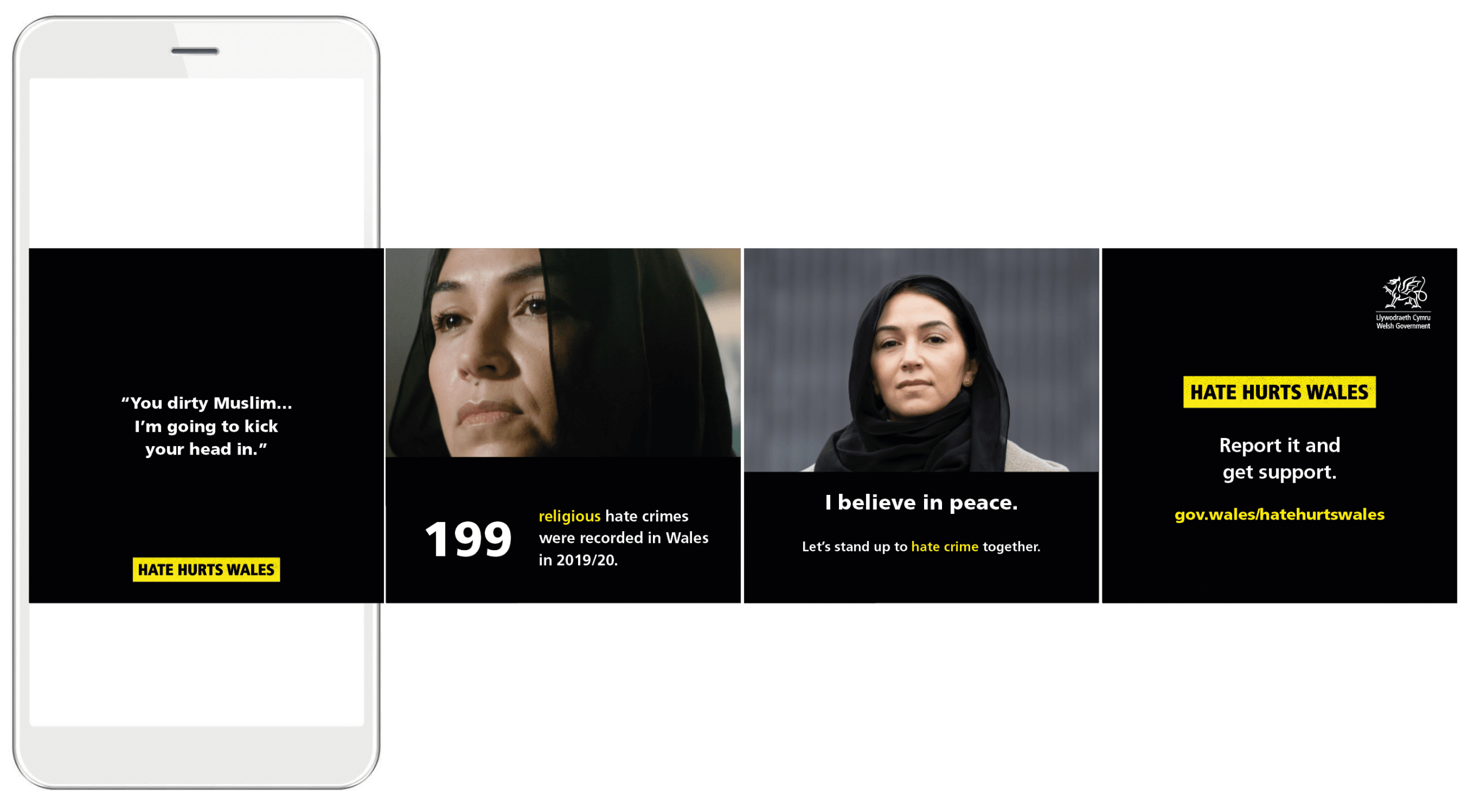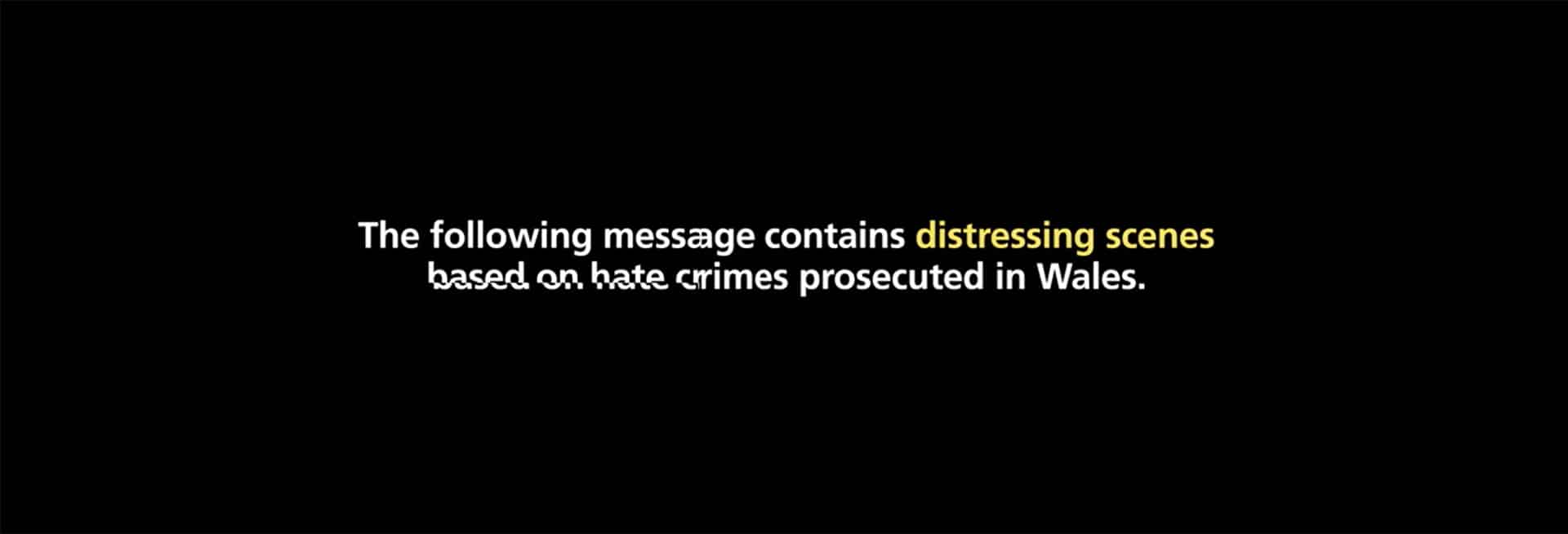 There are five key characteristics protected by hate crime laws: race, religion, sexual orientation, transgender identity, and disability. The campaign featured each one, based on real-life stories of abuse suffered by victims of hate crime in Wales. Hostile, shocking verbal and online abuse put the spotlight on prejudice. It ‘hurts’ to watch and to listen, compelling the audience to experience hate from the point of view of victims. It shows that hate hurts everyone, our communities and Wales.